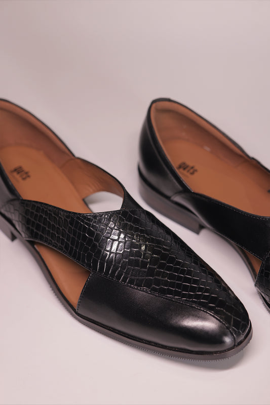 Black Leather Peshawari Jutti with Wooden Sole