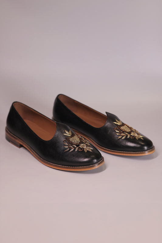 Handcrafted Black Leather Jalsa with Embroidered Crest & Wooden Sole