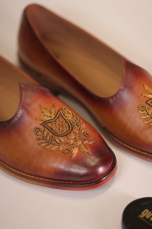 Handcrafted Brown Tan Leather Jalsa with Embroidered Crest & Wooden Sole