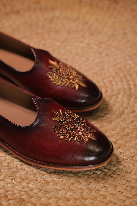 Handcrafted Maroon Leather Jalsa with Embroidered Crest & Wooden Sole